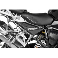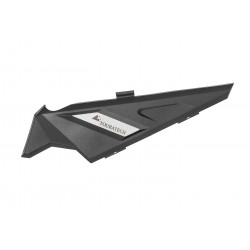 Le carénage latéral visuellement en deux parties est relié à une pièce en inox, gravée au laser, anodisée et de qualité supérieure pour former une unité parfaite, facile à monter et à démonter. En conséquence, les bottes restent moins coincées sur le cadre du véhicule et aucun équipement ne s'accroche involontairement sur le véhicule.