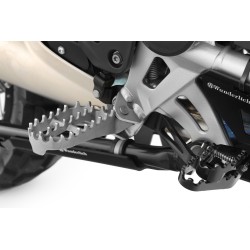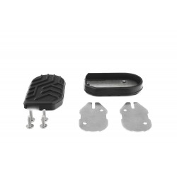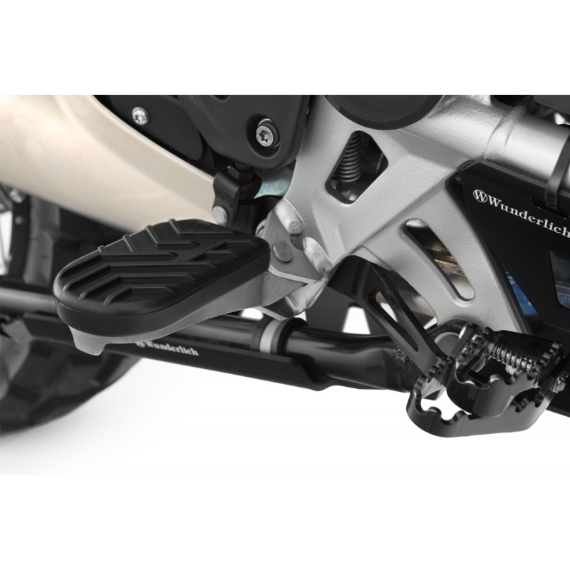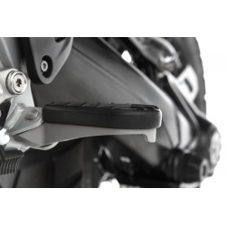 C'est précisément dans ce contexte que nous avons développé nos patins de caoutchouc de repose-pied pour une utilisation de tous les jours, pour le voyage, pour les trajets quotidiens au bureau ou l'utilisation en ville. Leur surface profilée assure un maintien parfait. Ils sont insérés par emboîtement, dépassent du bord des repose-pieds d'origine et l'encadrent, de sorte que le contact avec le tibia reste assurément sans conséquences. Le contact avec les chaussures. quoi qu'il en soit. Ils assurent en outre un amortissement agréable des vibrations du moteur. Le contre-support formé avec précision, vissé deux fois par en-dessous, garantit un excellent maintien du repose-pieds. Et pour celui qui fait du tout-terrain, il peut facilement et rapidement les éliminer dans les utilisations extrêmes.